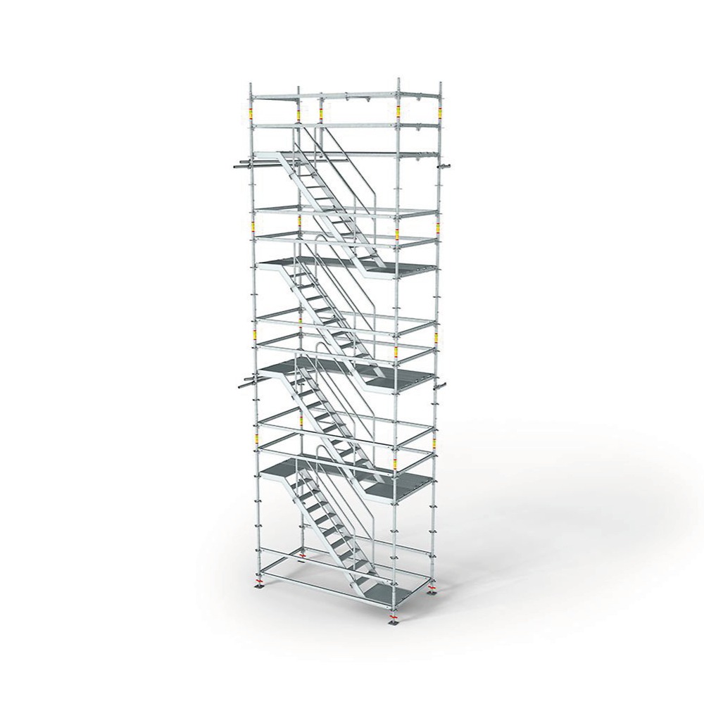 Las zancas de escalera de 75 cm de ancho son de aluminio, por ende ligeras y se colocan sobre los largueros UH del andamio modular PERI UP. Permiten montar torres de escalera de 4 apoyos, con zancas paralelas o alternadas, de hasta 100 m de altura. La escalera de aluminio PERI UP Flex 75 está dimensionada para una carga de 2,00 kN/m² y sirve de acceso a lugares de trabajo o a obras.