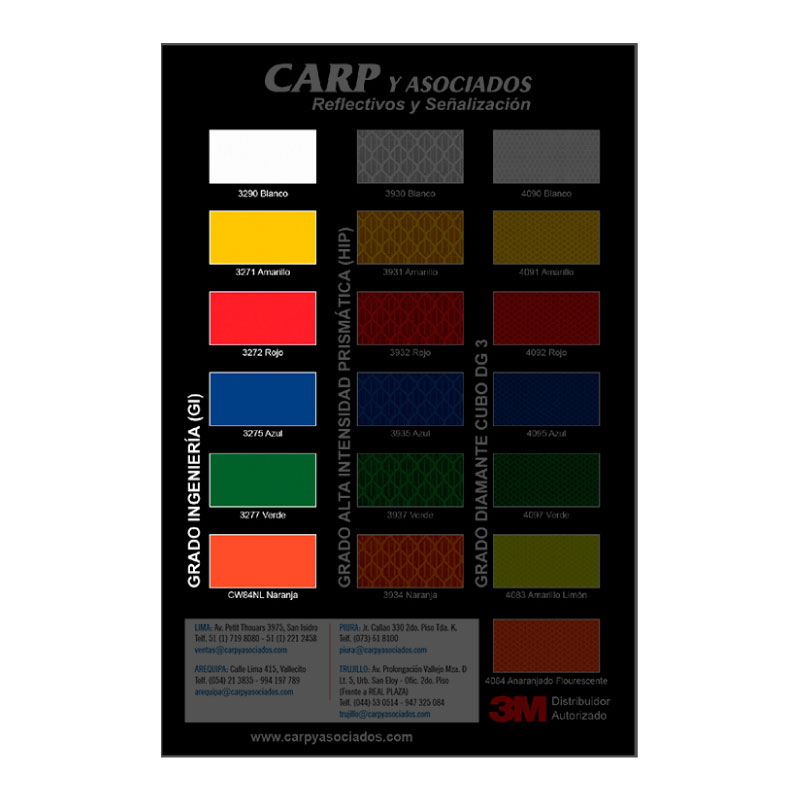 Lámina reflectiva autoadhesiva fabricada con tecnología de microesferas de vidrio incorporadas, durable y utilizada en señalizaciones de tránsito en zonas de menor circulación y bajas velocidades, y en señalética reflectiva en general. Su brillo inicial es alrededor de 70 candelas por lux mt2(color blanco).